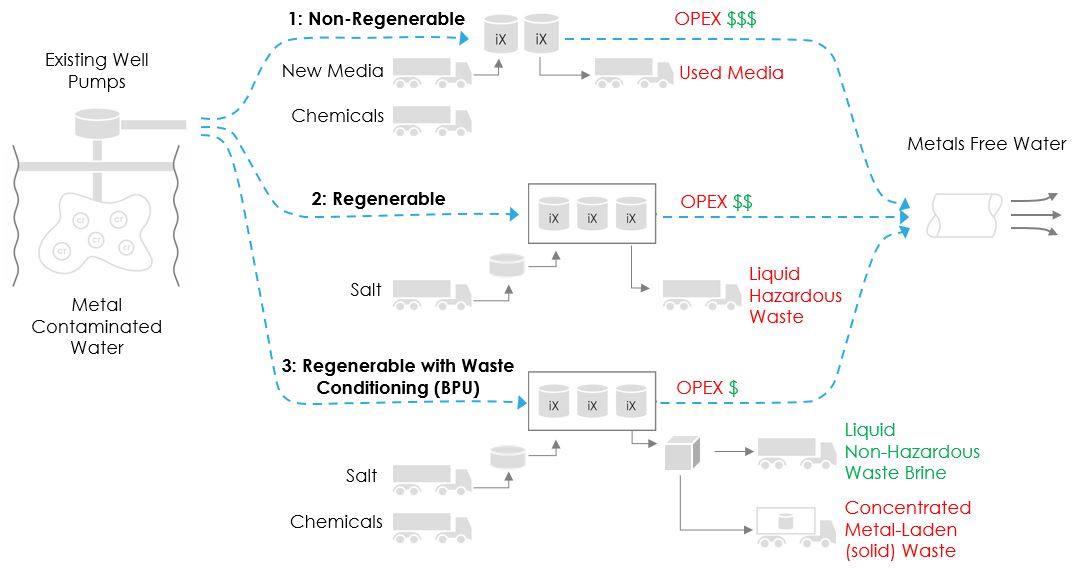 Ion exchange water treatment systems: This diagram compares three options for treating metal-contaminated water. Regenerable IX systems are displayed as options 2 and 3, with the third option incorporating an additional brine processing unit (BPU). This addition offers extra operational expenditure savings (OPEX), making it the most economically advantageous and sustainable choice due to its non-hazardous waste brine outputs.